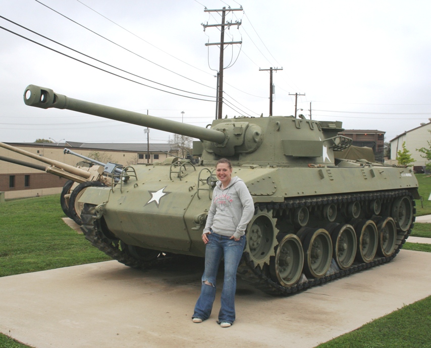 Here is a photo of my daughter, Sandi. Pop Pop is her great grandfather. Sandi is stationed at Fort Hood in the military police brigade. She's pictured here posing in front of an M18 tank destroyer.